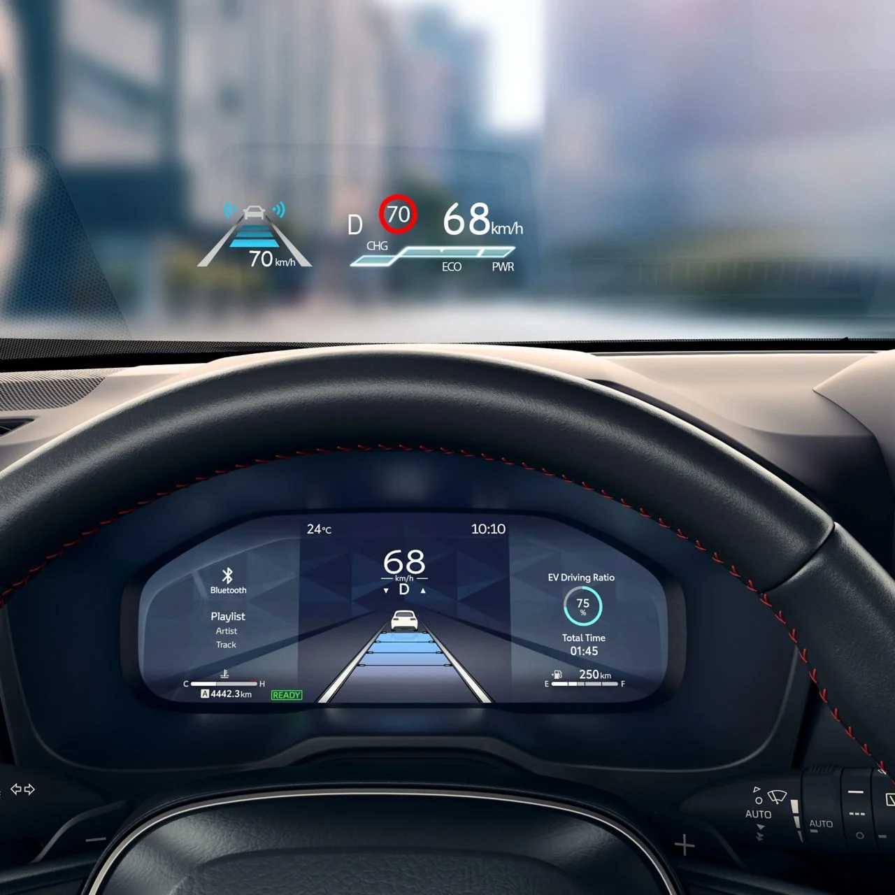 Im ausdrucksstarken Außendesign des RAV4 Plug-in Hybrid verbirgt sich ein nahtloses Multimedia-Paket. Auf dem Armaturenbrett ist ein intuitiv zu bedienender 10,5-Zoll-Multimedia-Touchscreen integriert und über Apple CarPlay™ kannst du kabellos die neuesten Smartphone-Modelle verbinden. Das Konnektivität in diesem leistungsstarken Hybrid eine große Rolle spielt, zeigen Funktionen wie die intelligente Sprachsteuerung und die Cloud-Navigation, die sich über das hochauflösende Farbdisplay bedienen lassen. Ein einfaches „Hey Toyota“ aktiviert das System und stellt dir die Cloud-Navigation mit den neuesten Karten-Updates sowie Verkehrs- und Routeninformationen in Echtzeit zur Verfügung.